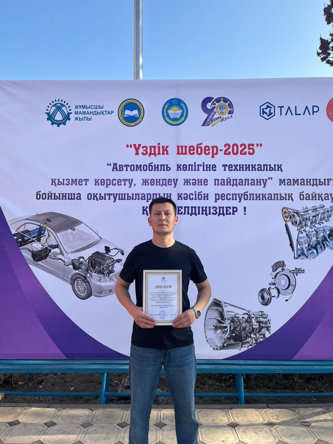 Преподаватель специальных дисциплин Талгарского колледжа агробизнеса и менеджмента Аманкелді Асылхан Бауыржанович стал призёром республиканского конкурса «Үздік шебер – 2025», состоявшегося в городе Туркестан среди педагогов организаций технического и профессионального, послесреднего образования. По итогам конкурса он был награждён дипломом III степени НАО «Talap» по специальности «Техническое обслуживание, ремонт и эксплуатация автомобильного транспорта».
